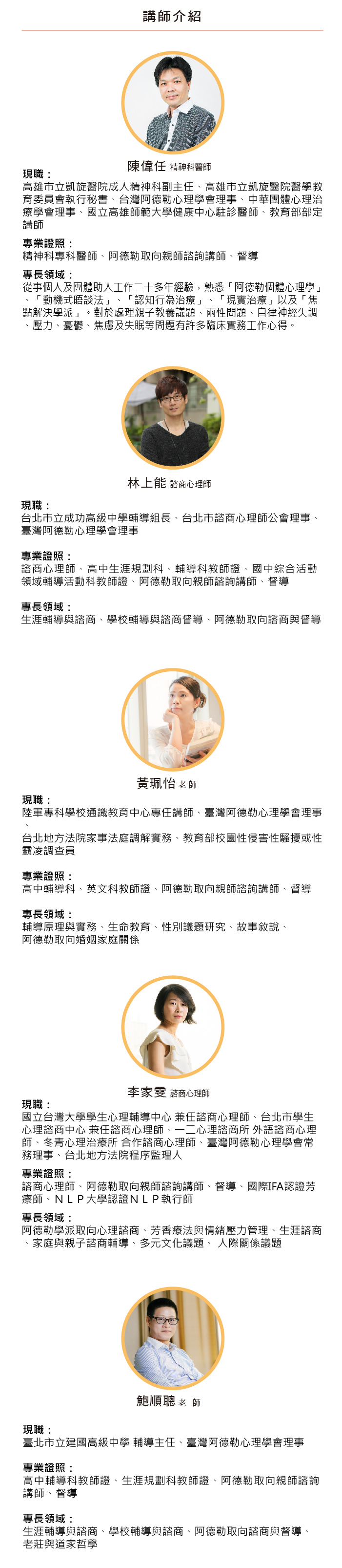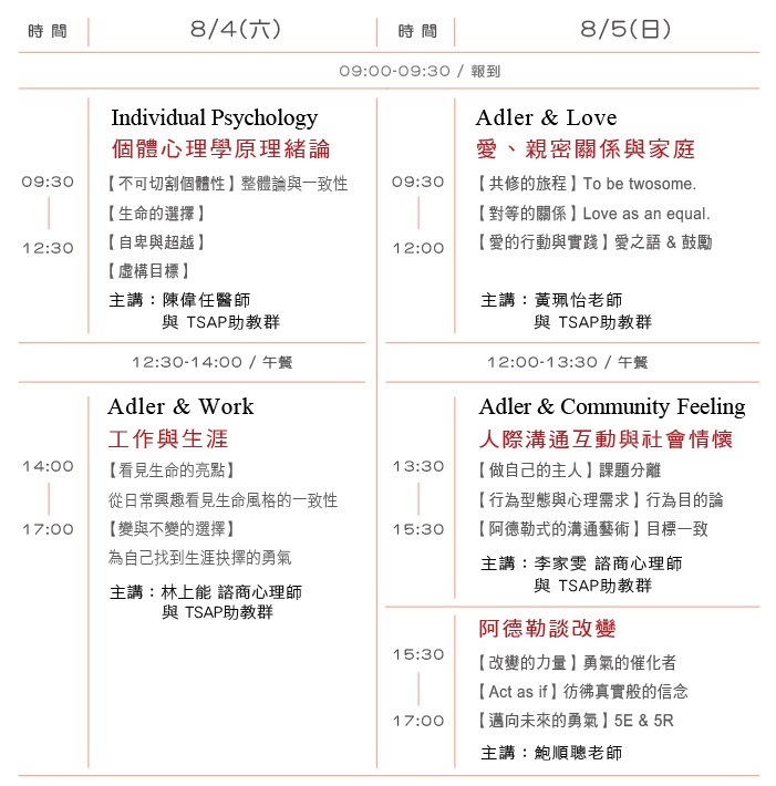 阿德勒(Alfred Adler, 1870-1937)與佛洛依德、榮格齊名,並稱「心理學三巨頭」。他除了是心理學發展承先啟後之人,更堪稱自我啟發之父!他主張個體是認知、情緒、行為不能分割、身心合一的整體觀,提倡關懷兒童、女性、弱勢社會平等之民主精神,並展現賦權的具體方法。所以,阿德勒的精神早在近一百年前,便透過家庭、學校、工作、社區等各種場域,開始發揮影響力,希望可以促進全人健康及社會福祉,而他的理論與實務架構更是擁有跨文化及超時空的普世價值。