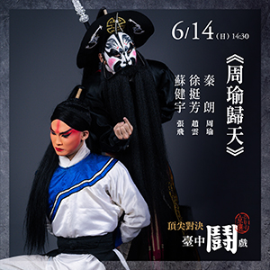 瑜亮鬥智,戰軍事,鬪巧計。 三國周郎——周瑜為孫吳陣營的靈魂人物,合縱連橫奠定三分天下。 週日以《黃鶴樓》《周瑜歸天》二戲,安排不同演出陣容,《黃鶴樓》由小生演員曹復永飾演周瑜,朱陸豪、張德天、吳仁傑等多位京劇界老練唱將同台飆演。《周瑜歸天》則由武生演員秦朗飾演周瑜,由徐挺芳、蘇健宇等青年演員同場較勁,展現矯健身手及深厚功底。觀眾可以在一齣戲中感受不同世代與行當的舞台魅力。